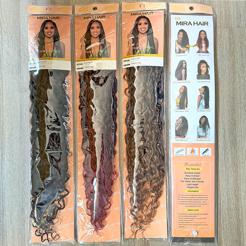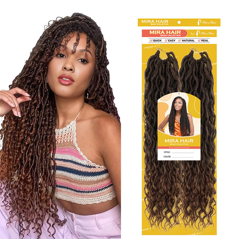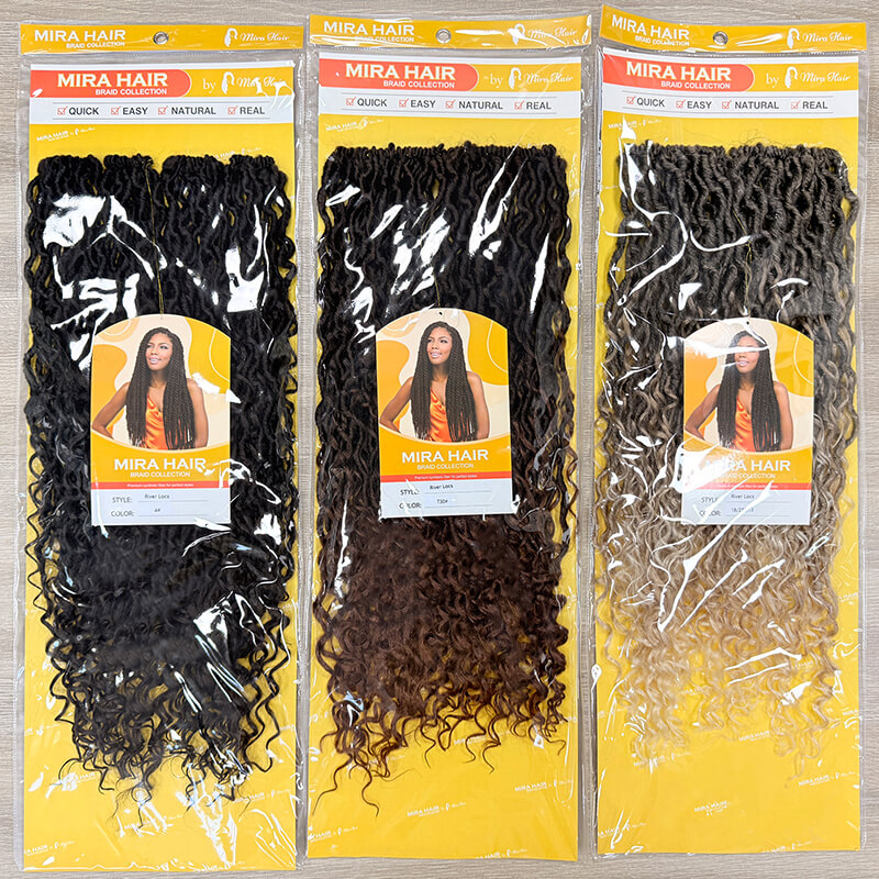 Mira River Locs are artsy knotted twists made from 100% Premium Fibres. Its natural, flowing boho style with voluminous, wavy ends is perfect for creating a “goddess” look. The crocheted loops are easy to install, ensuring wearers don’t have to worry about wearing them uncomfortably. Available in single or three-piece sets.